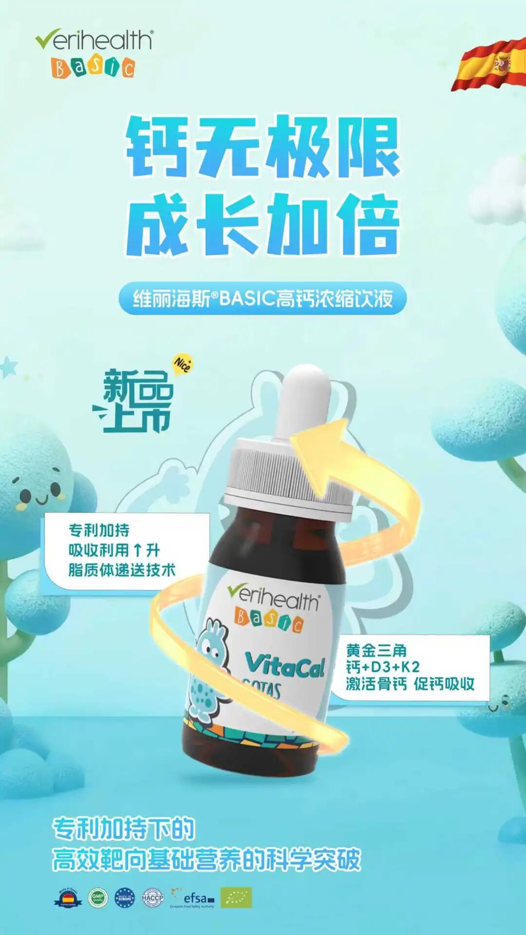 近日,西班牙维丽海斯BASIC系列新品——高钙浓缩饮液正式上市。凭借创新的“植物载体×科学精粹”双螺旋组合技术,破解了传统补钙产品吸收率低、易引发胃肠不适的消费痛点,为全年龄段人群提供了冬季补钙的新一代解决方案。