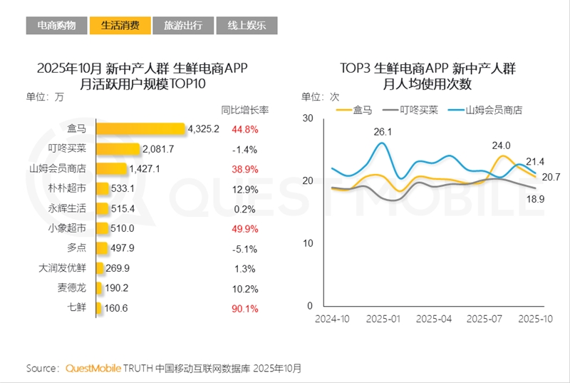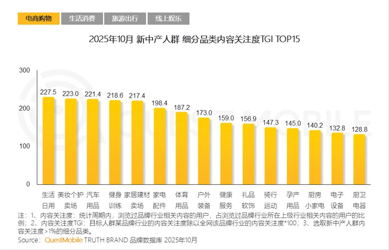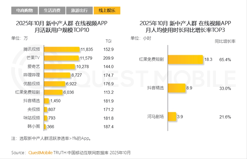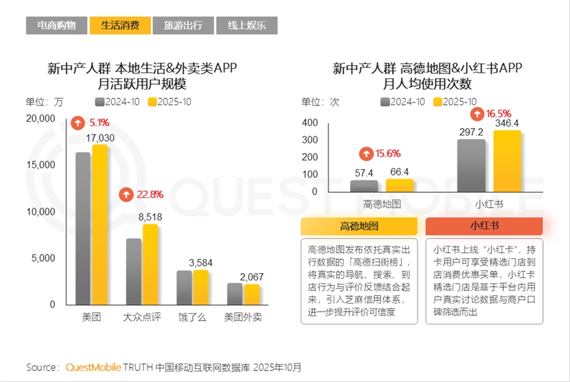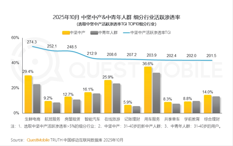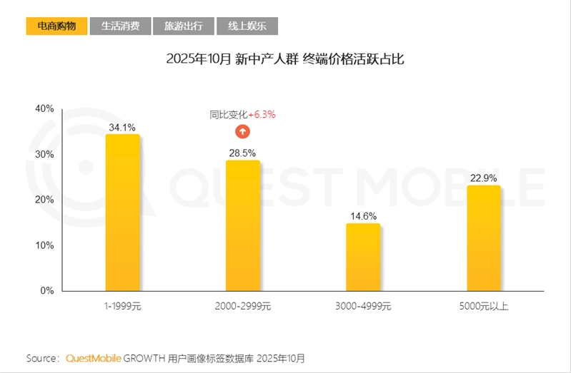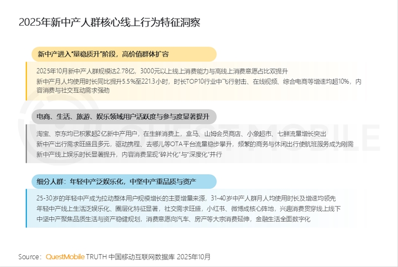 QuestMobile数据显示,2025年10月新中产人群用户规模达到2.78亿,同比净增长317.4万,全网占比微降0.2个百分点。