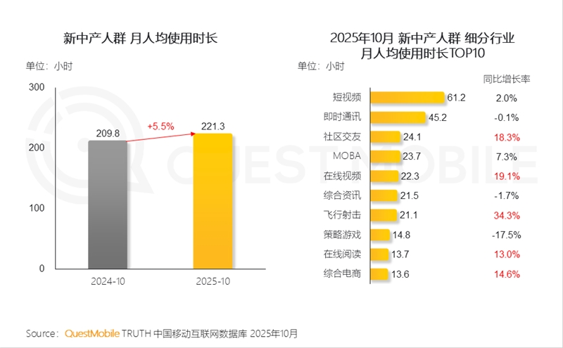 5、新中产群体互联网使用时长显著提升,TOP10行业中,飞行射击、在线视频、社区交友、综合电商、在线阅读行业同比增速均超过10%,显示出内容消费与社交互动领域的强劲需求