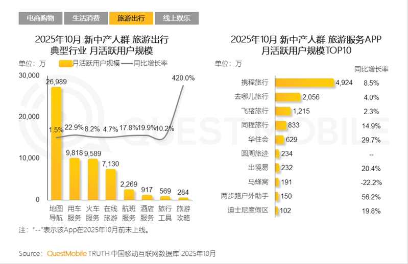 第三,休闲旅游新业态,以及AIGC、智能汽车、智能健康等新产品和服务的持续进化,则为新中产群体的消费需求释放提供了可靠路径。2025年10月,旅游攻略、AIGC、飞行射击(游戏)、智能健康、汽车社区占据了月活用户规模增长率TOP5的位置,同比增长分别达到420%、165.1%、48.1%、37.4%和36.7%!