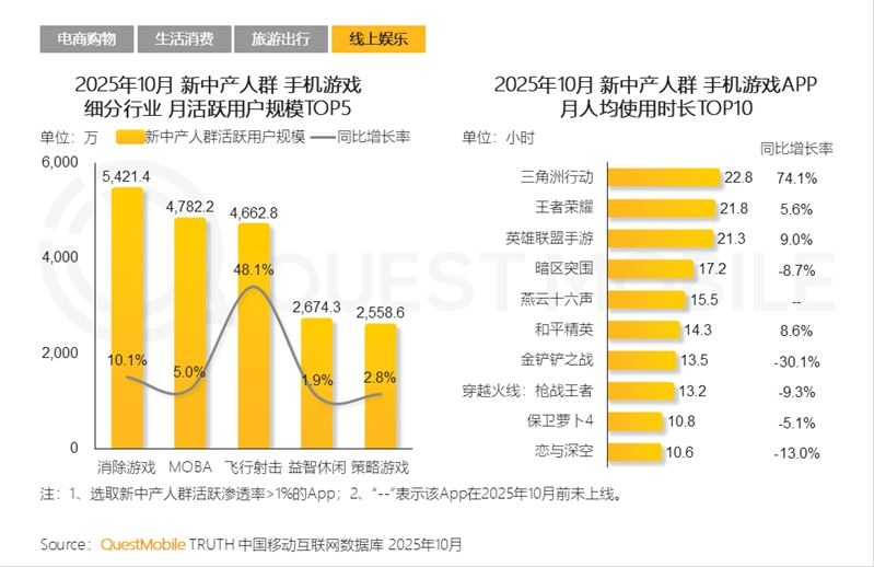 12、新中产游戏偏好呈现“休闲+竞技”双轨并行特征,射击与MOBA类游戏主导用户时长,且游戏时长呈现上升趋势,新兴游戏如《三角洲行动》《燕云十六声》表现更加突出