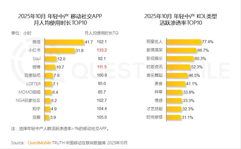 4、社交APP是年轻中产的“数字生活中心”,小红书与微博成为内容消费的核心阵地,知乎、豆瓣等垂直社区满足深度兴趣,内容偏好上,娱乐化内容占据主导