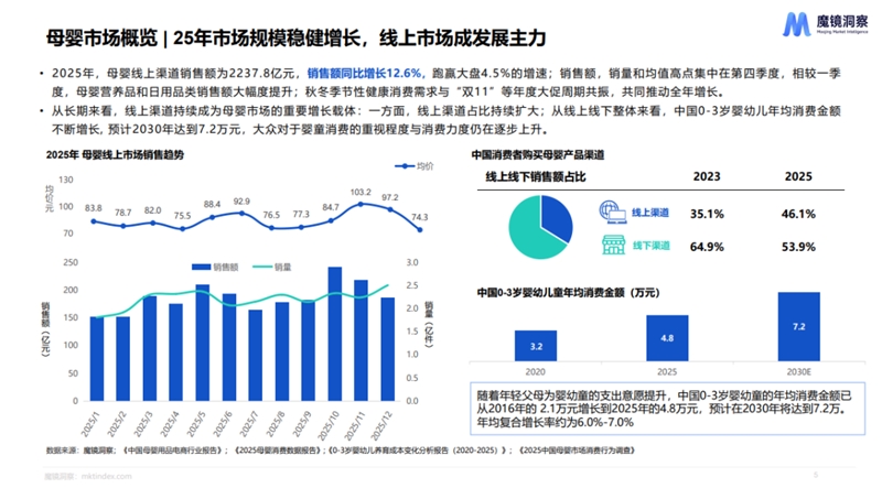 白皮书提到,2025年母婴线上渠道销售额为2237.8亿元,销售额同比增长12.6%,跑赢大盘4.5%的增速。