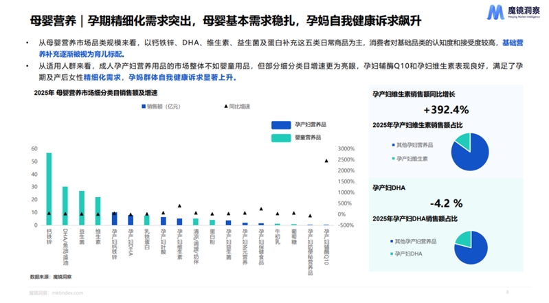 从适用人群来看,成人孕产妇营养用品的市场整体不如婴童用品,但部分细分类目增速更为亮眼,孕妇辅酶Q10和孕妇维生素表现良好,满足了孕期及产后女性精细化需求,孕妈群体自我健康诉求显著上升。