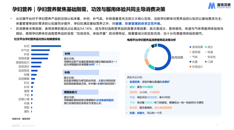 从社媒平台对于孕妇营养产品的功效认知来看,补钙、补气血、补铁是最受关注的三大核心功效,当前孕妇群体对营养品的认知仍以基础需求为主;体重管理等进阶需求的认知度同步提升,孕妇在满足基础营养之外,对健康、形象管理的诉求正在升级。