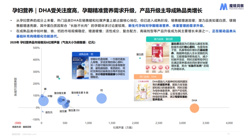 潜力品类如蛋白质、镁销售额增速亮眼,其中蛋白质因契合“长胎不长肉”的孕期诉求讨论度较高,新生代孕妈对孕期精准营养、体重管理的需求升级。