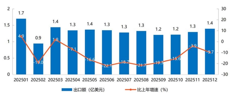 从月度走势来看,2025年12月的出口额延续了年内波动下行的态势,相较于上年同期的出口规模减少约0.15亿美元,降幅达9.7%,成为全年增速表现较弱的月份之一。