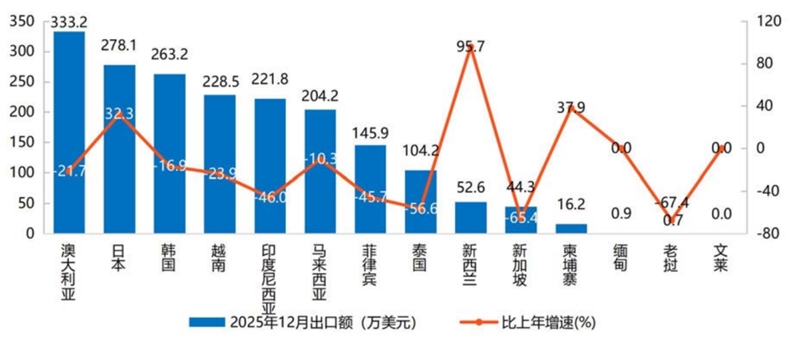 具体来看,澳大利亚是RCEP成员国中第一大出口目的地,当月出口额333.2万美元,同比下降21.7%,占对RCEP成员国出口额的17.6%,依旧占据主导地位;日本则成为区域内的增长亮点,当月出口额278.1万美元,较上年同期增加67.9万美元,增量居RCEP成员国首位;越南作为东南亚主要成员国,当月出口额228.5万美元,同比下降23.9%,反映出东南亚市场的整体疲软态势。