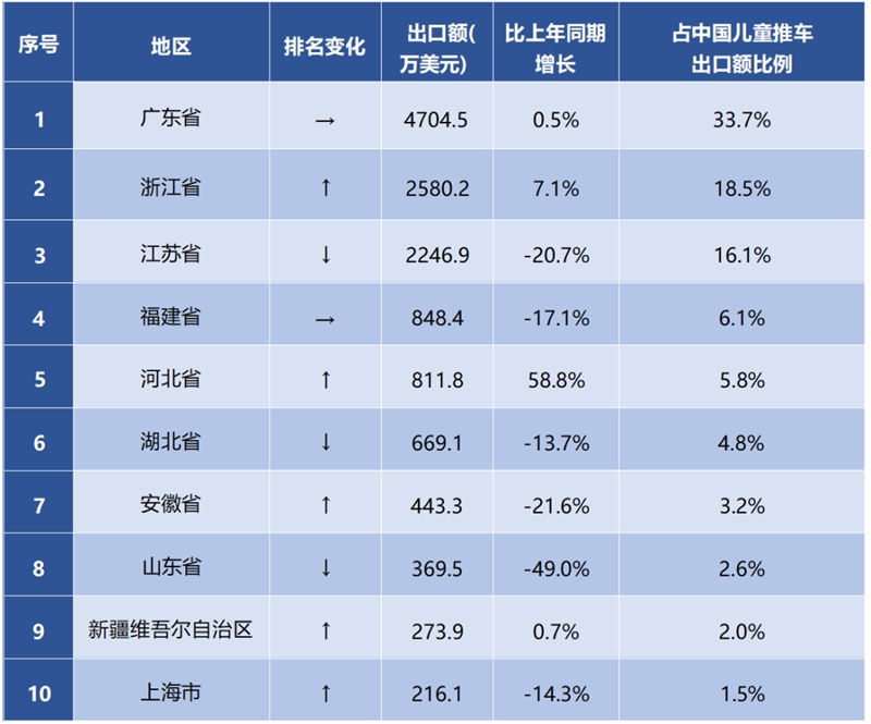广东省当月出口额达4704.5万美元,同比增长0.5%,在整体出口下滑的背景下实现正增长,占中国儿童推车总出口额的33.7%,较上年同期提高3.4个百分点,其出口规模远超其他地区,依旧是儿童推车出口的核心基地。