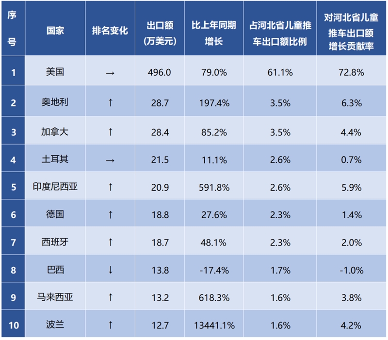 深入分析来看,河北省出口的快速增长主要得益于对美国市场的旺盛需求,当月河北省对美国出口儿童推车496.0万美元,同比增长79.0%,占河北省总出口额的61.1%,对河北省出口增长的贡献率高达72.8%,成为拉动河北省出口增长的核心动力。