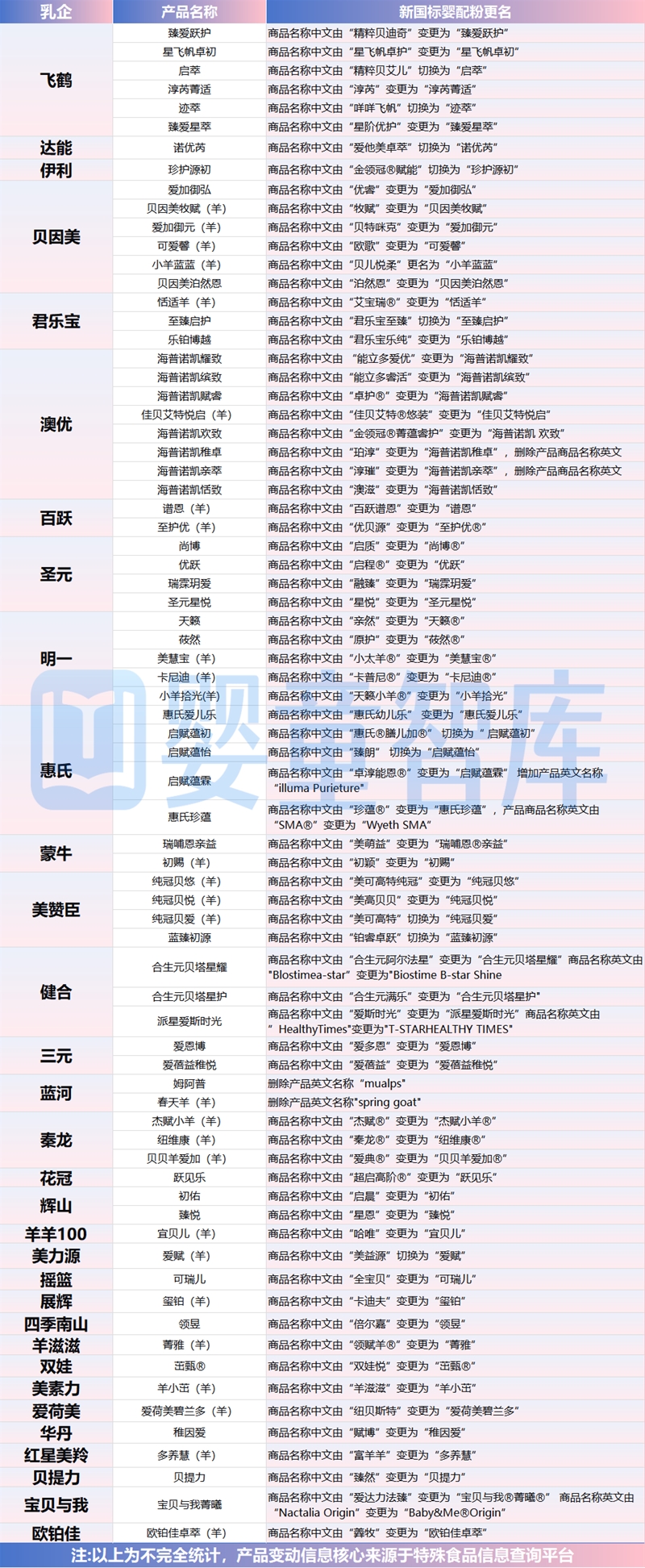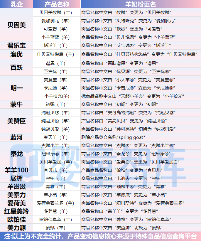 值得注意的是,自新国标正式实施后,羊奶粉产品的更名现象更为集中,统计共有27款羊奶粉更名。除前述君乐宝“艾宝瑞”更名“恬适羊”外,还包括蒙牛“初颖”更名为“初赐”、美赞臣的“美可高特”切换为“纯冠贝爱”、贝因美“贝特咪克”更名为“爱加御元”、百跃“优贝源”更名为“至护优”、明一“天籁小羊®”变更为“小羊拾光”等。