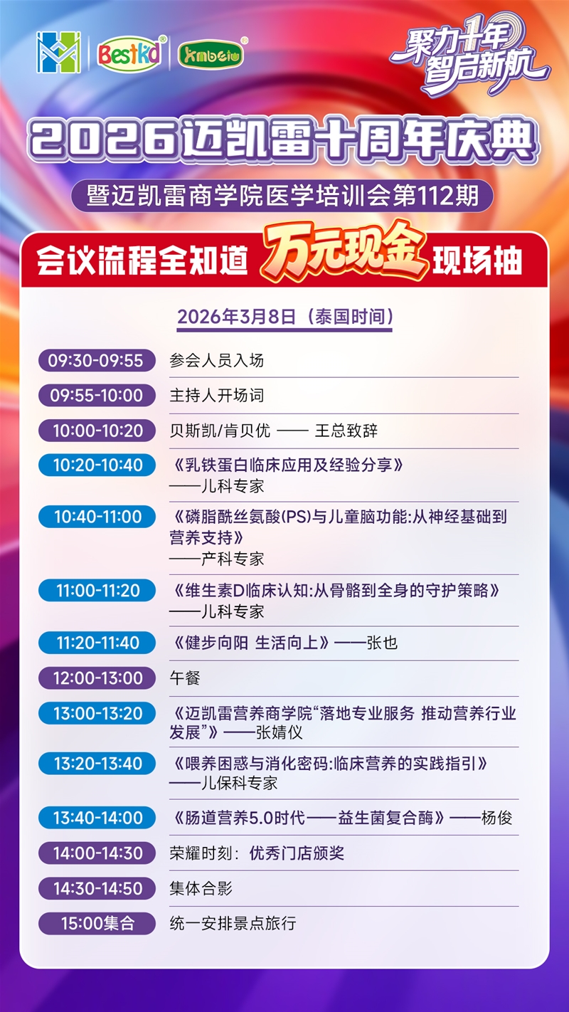 泰国之行首日,迈凯雷将率先召开“十周年庆典暨迈凯雷商学院医学培训会第112期”。先聚力,再狂欢!迈凯雷将在泰国这片热土上,回顾往昔,解读未来,并为风雨同舟的合作伙伴们献上最诚挚的致意!