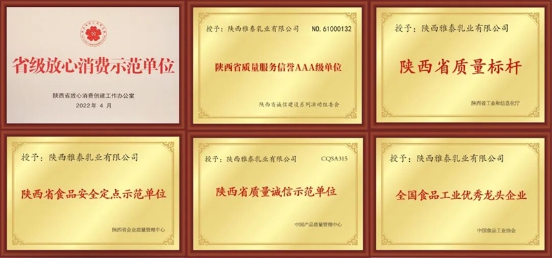 在乳业的品质征途上,雅泰乳业一路高歌猛进,荣誉加身。斩获 “全国食品工业优秀龙头企业”殊荣,成为行业典范;荣膺“陕西省质量标杆”,以卓越品质树立区域榜样;入选“陕西食品安全定点示范单位” 以及“陕西质量诚信示范单位”,为食品安全与诚信经营筑牢坚实防线;更获评“省级放心消费示范单位”,让消费者购物无忧、安心选择。此外,雅泰乳业还将 “陕西省质量管理优秀奖” 揽入怀中,旗下多款羊乳产品也屡获行业大奖,用实力印证了品牌在品质领域的标杆地位。