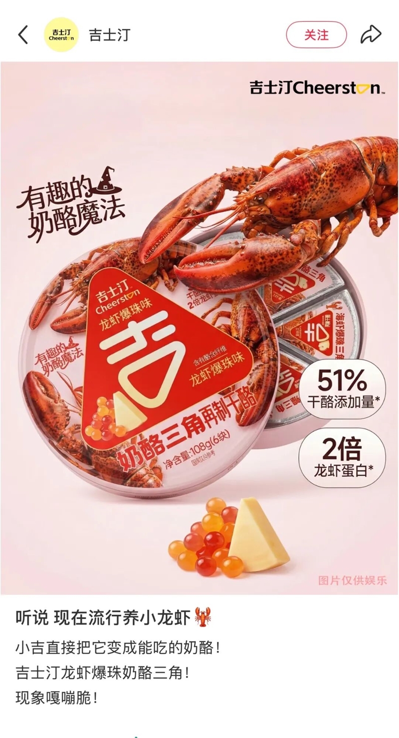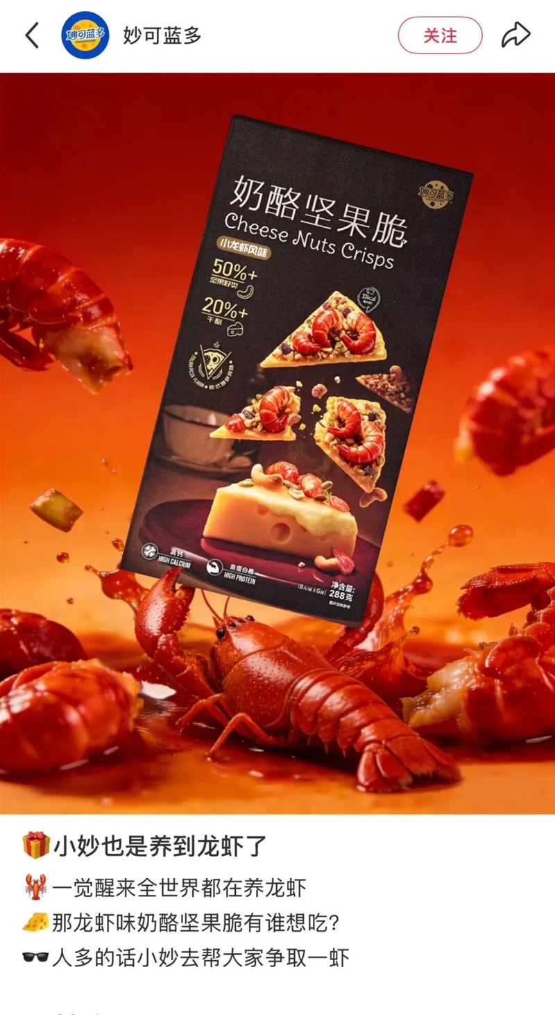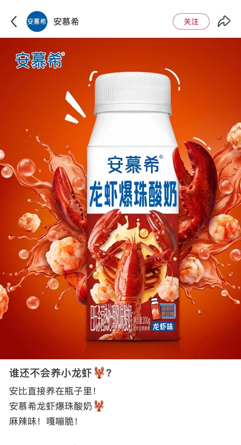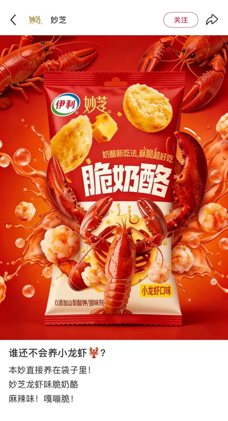 安慕希、妙可蓝多、燕塘、来思尔、妙芝、吉士汀等纷纷加入“养龙虾”大军,发布龙虾味产品的AI创意海报,吸引网友关注和互动。