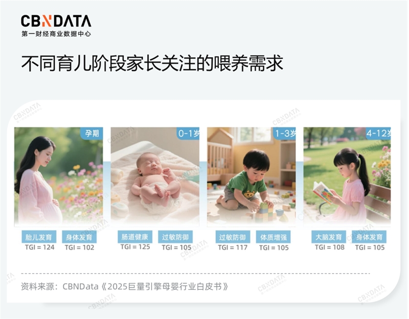 纵向上,不同育儿阶段下,家长关注的喂养重点不同,“分龄精养”成为新一代父母的育儿共识。家长对母婴产品的选择已从过去的“通用型”转向以生理发育阶段为轴心的“精准匹配”。在0-1岁阶段,喂养过程中肠道健康与过敏防御是家长关注的重心;进入1至3岁后,除过敏问题外,体质增强成为新焦点;而当孩子步入4至12岁的学龄期,大脑发育与身体成长则成为核心关注维度。