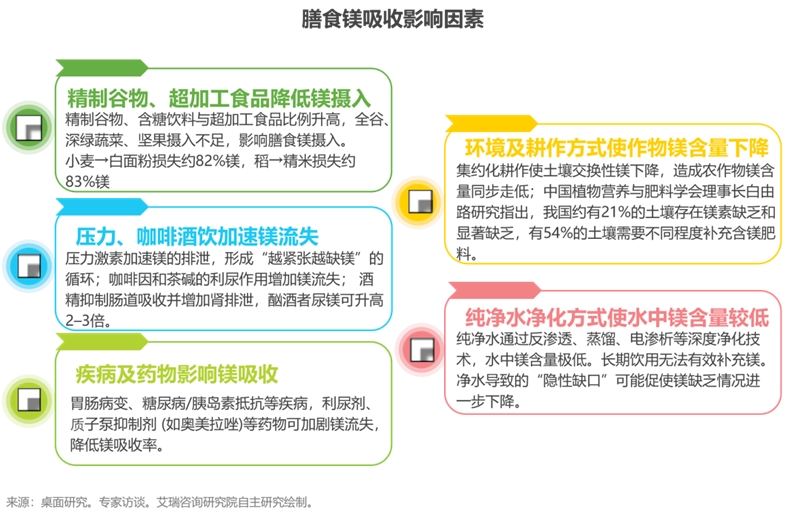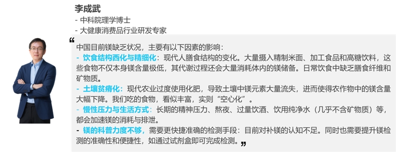 -饮食结构西化与精细化、土壤贫瘠化、慢性压力与生活方式、镁的科普力度不够是影响镁流失和镁缺乏的主要因素。
