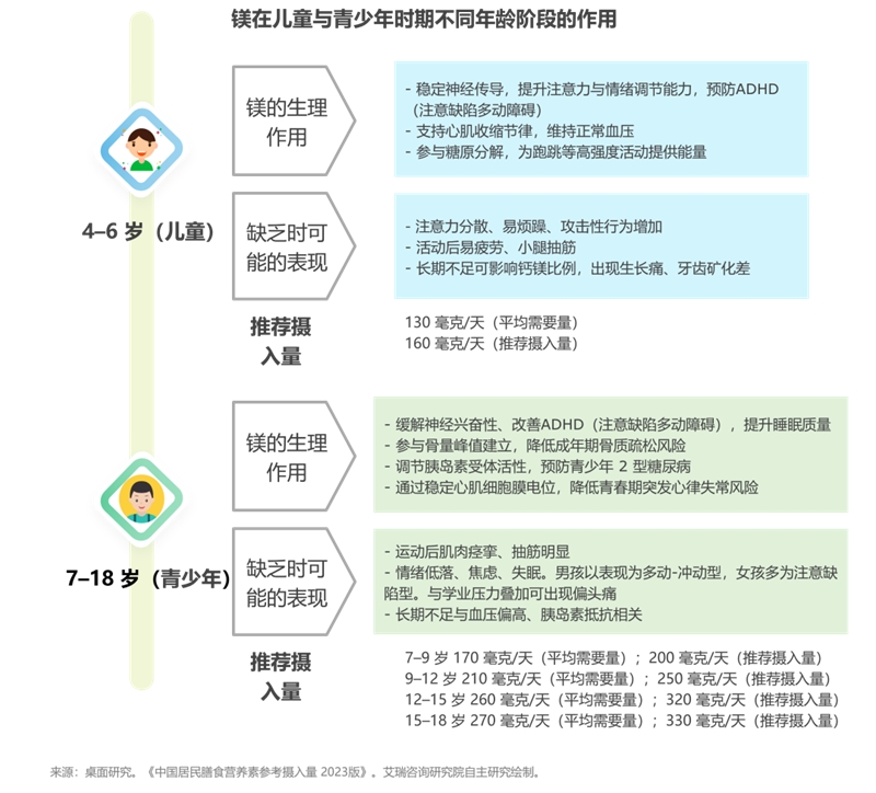 镁对于青少年神经、供能、骨骼、心律稳定发挥重要作用。随年龄增长需求摄入量增大