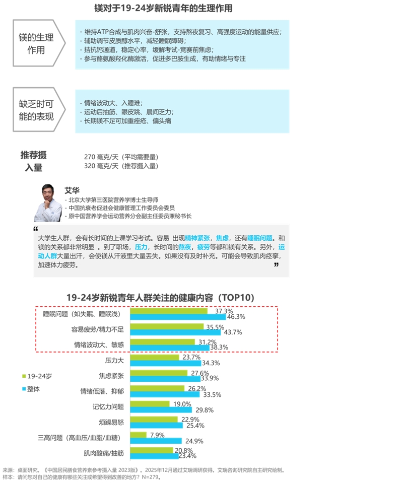 19-24岁面临大学-职场转换,该年龄段人群熬夜复习、通宵加班、运动健身并行,对于能量需求较高; 同时由于学业及初入职场压力引发的皮质醇高、睡眠质量波动,焦虑等情况较为频繁。现代生活方式中的外卖、咖啡、奶茶亦加速镁流失。通过甘氨酸镁、苏糖酸镁等有机镁补充,可帮助新锐青年助眠、缓焦虑、提专注,为人生第一场“续航”充电。