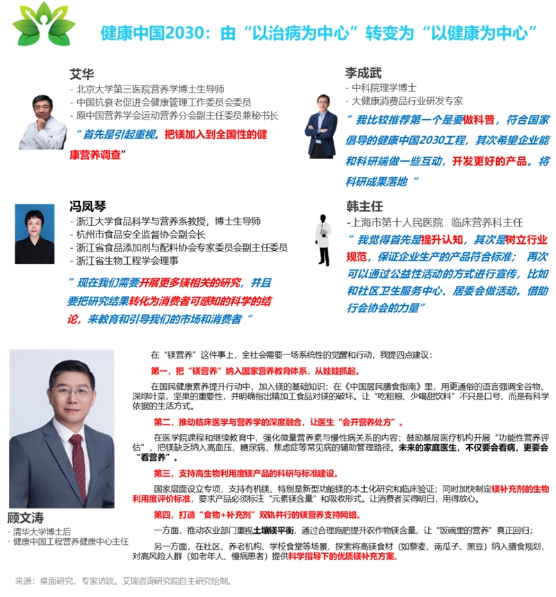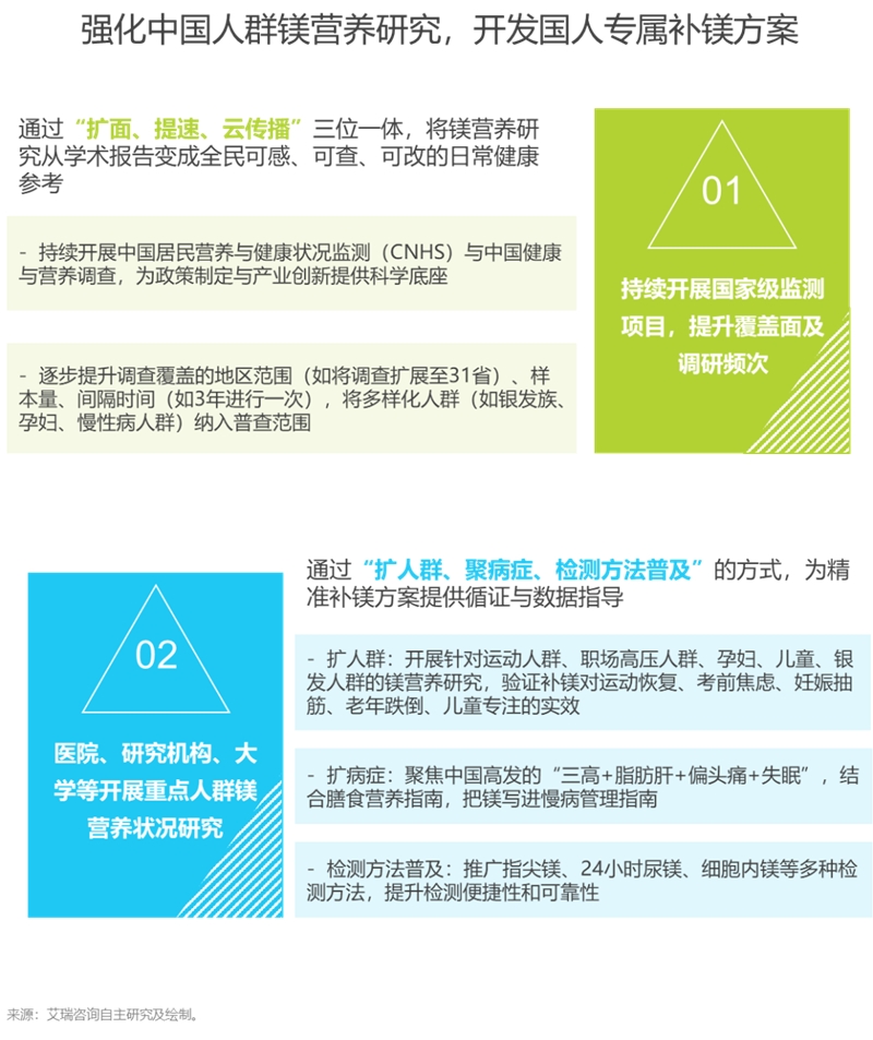 倡议与展望:在“健康中国2030”战略下,通过科普、定期监测、规范行业标准、打造“食物+补充剂”的补镁网络等多种手段,提升全民镁营养水平