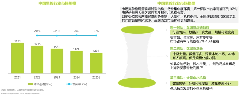 2021-2025年中国早教市场规模由1921亿元降至1291亿元,年复合增速约负9.5%,主要是受到疫情冲击、出生人口下降、普惠性托育发展的影响。