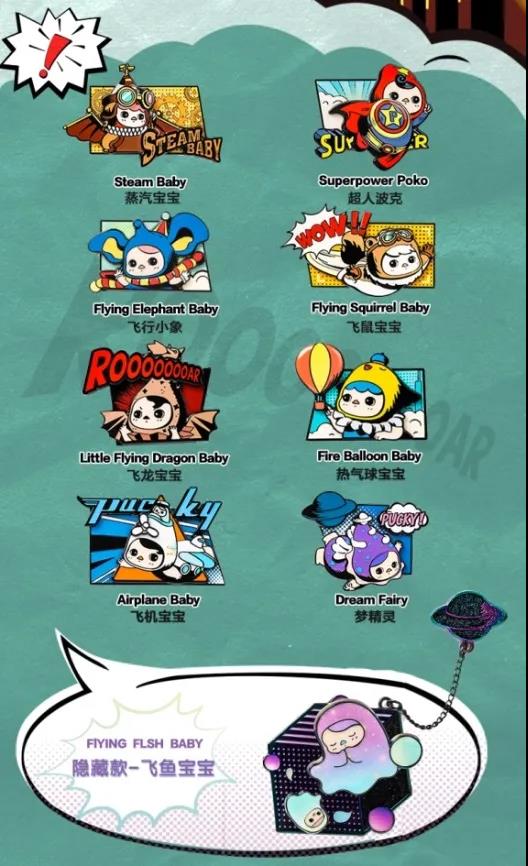 泡泡玛特新推出的PUCKY精灵飞行系列徽章盲盒,将PUCKY精灵与飞行主题结合,每一款搭配了不同的飞行方式或童话中的飞行动物,色彩鲜艳,人物形象更灵动。