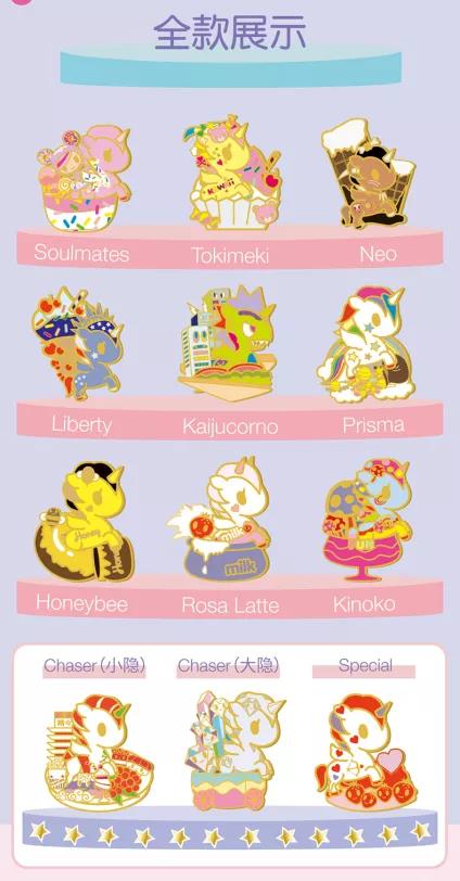 源于日本文化灵感的潮流品牌Tokidoki淘奇多奇,包含众多或可爱或俏皮的卡通形象,其充满少女心的“独角兽家族”受到女性年轻群体的喜爱。Tokidoki淘奇多奇推出的独角兽sweet party金属徽章盲盒,以不同的独角兽形象在参加聚会时的装扮、表情等为主题,带来独特的风格体验。