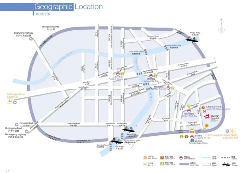 上海新国际博览中心(SNIEC)坐落于上海浦东经济与工业核心发展区。地铁7号线可直达SNIEC,其花木路站紧邻上海新国际博览中心W5号展厅。此外,大型交通枢纽中心—龙阳路站(位于龙阳路上)距离SNIEC仅600余米,地铁2号线、地铁7号线、磁浮列车、以及多条公交线路交汇于此,由龙阳路站步行10分钟,即可抵达SNIEC。
