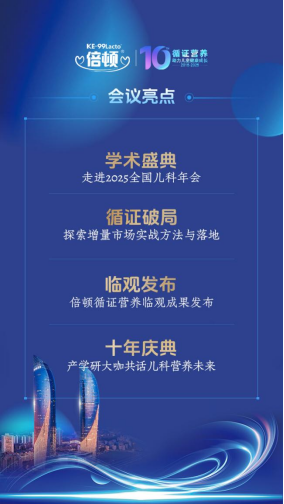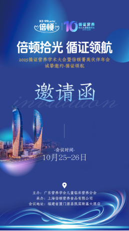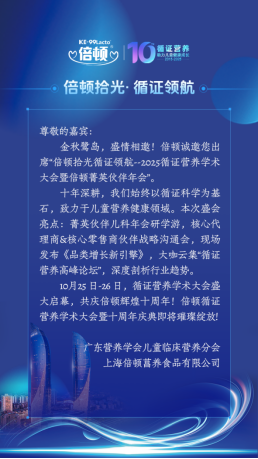 值此倍顿成立十周年之际,由广东省营养学会儿童临床营养分会主办、上海倍顿营养食品有限公司承办的“倍顿拾光·循证领航——2025循证营养学术大会暨倍顿菁英伙伴年会”将于10月25-26日在厦门(源昌凯宾斯基大酒店)与中华医学会第三十次儿科学术大会同期举行,为行业呈现一场高阶学术盛宴与产业交流盛会。