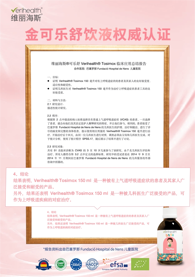 [2]2014年巴塞罗那 Fundació Hospital de Nens ⼉童医院通过51 名临床诊断为 CVAS 的 3 至 10 岁儿童进行了对于维丽海斯金可乐舒的研究。研究结果:Verihealth® Tosimox Surup 150 ml 是一种被儿科医生广泛接受的产品;亦被有上气道呼吸道症状的患者及其家人广泛接受和耐受。