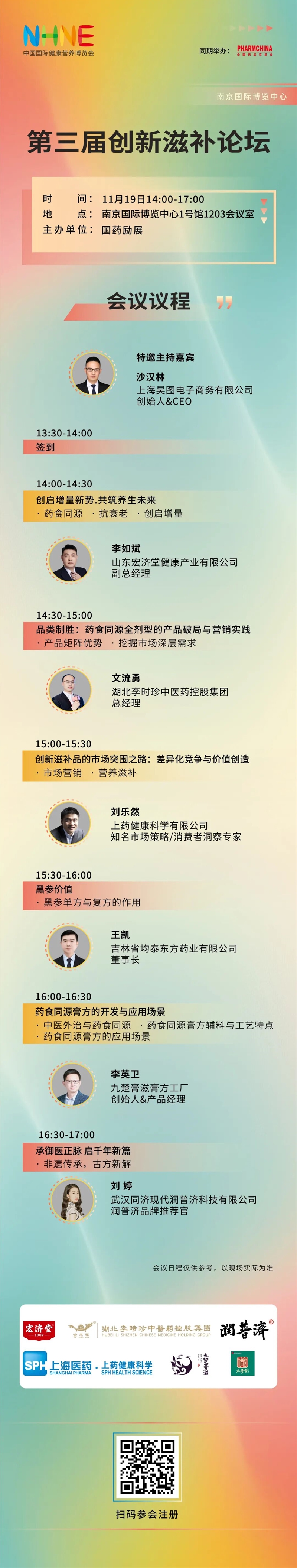 作为健康营养领域的“风向标”,NHNE中国国际健康营养博览会将于11月19-21日在南京国际博览中心举办,将集以“新滋补展区”和论坛结合的形式呈现行业风口!第三届创新滋补论坛汇聚山东宏济堂、湖北李时珍、上药健康科学、吉林均泰东方、九楚膏滋、同济现代润普济等龙头企业共同探讨,携手共掘滋补新红利!【扫描下方海报二维码,报名参会】