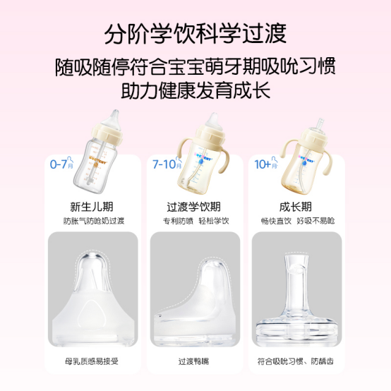 除了防呛技术的突破,舒婴更以“分阶喂养”为核心理念,构建了一套覆盖婴幼儿各成长阶段的产品矩阵。从适合新生儿的经典防呛奶瓶,到帮助学步期宝宝自主饮水、配备重力球装置的吸管杯,舒婴始终根据宝宝口腔发育、吮吸能力与行为特点进行针对性设计。这种科学分阶的产品逻辑,不仅是对喂养工具的功能性完善,更是对婴幼儿成长规律的尊重与适配。