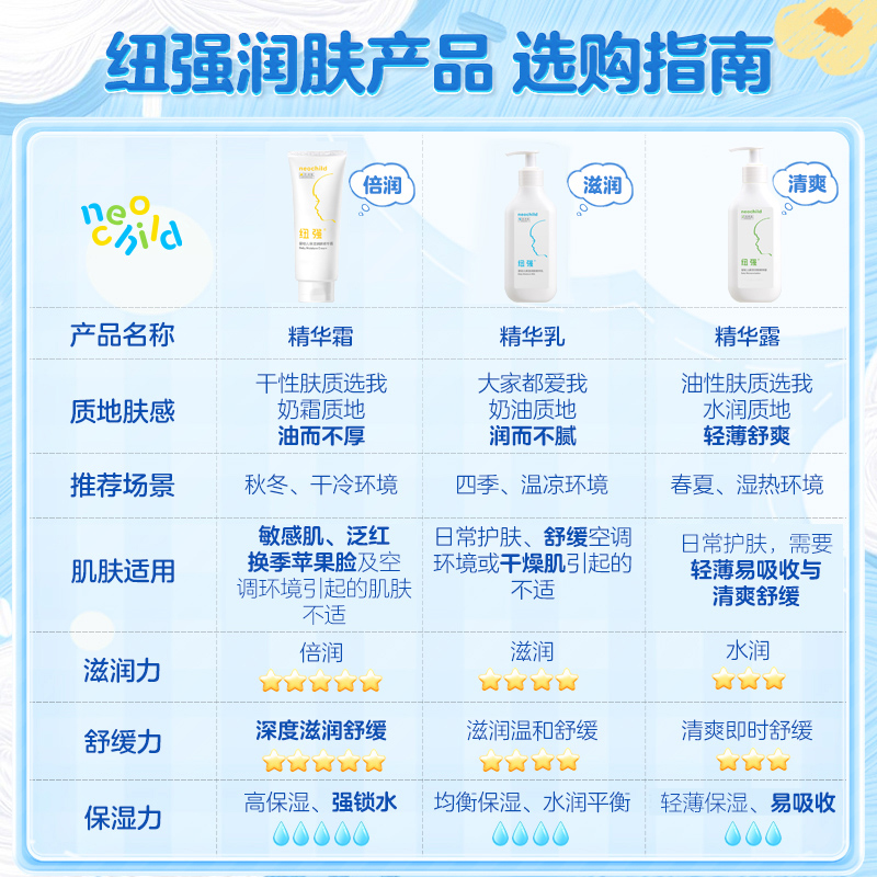 对于大多数宝宝春季护肤需求而言,建议可从不挑肤质、四季可用的纽强婴幼儿保湿润肤精华乳(蓝纽乳)开始尝试;若皮肤已有明显干燥、脱屑或泛红,则需使用质地更厚重的、滋润度更高的纽强婴幼儿保湿润肤精华霜(黄纽霜)进行密集保湿和修护。