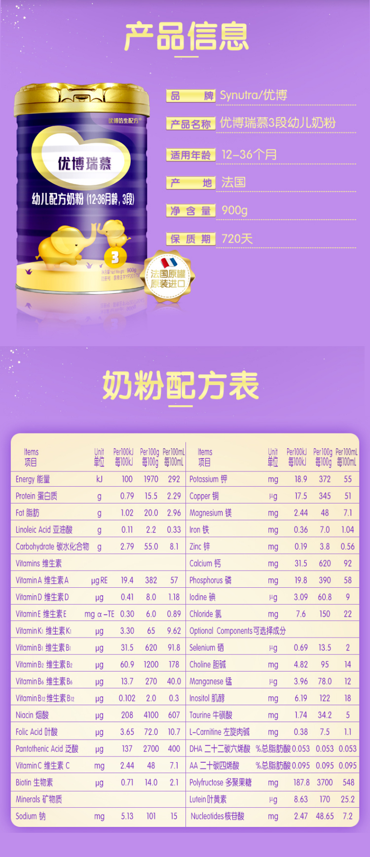 优博瑞慕幼儿配方奶粉,法国原罐原装,采用全乳清蛋白配方, 以优博仿生配方®为基准; 突破性研制全乳清蛋白配方; 乳清蛋白和酪蛋白比例高达9:1。