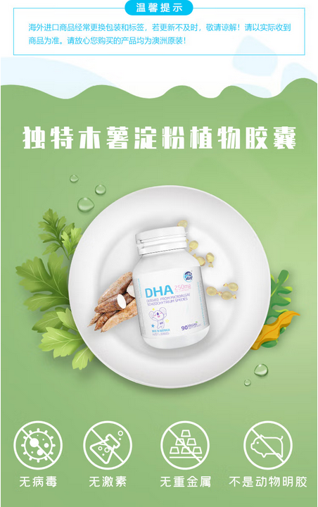 澳乐乳儿童DHA胶囊,用木薯淀粉做胶囊皮,植物成分提取,无重金属,经过了澳大利亚药品监督管理局TGA认证。