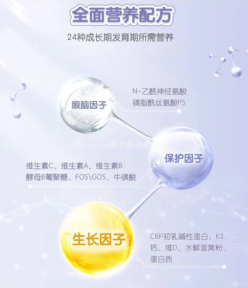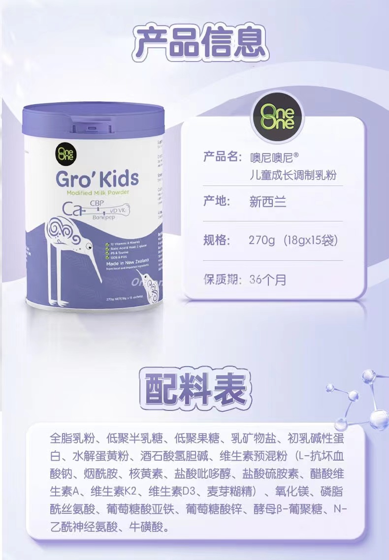 噢尼噢尼长高高TM儿童成长调制乳粉是由噢尼噢尼实验室联手新西兰国家食品创新实验室共同研发,采用“6大成分精准长高,24种营养均衡成长”理念,专为3-14岁身高增长关键期孩子的全营养儿童奶粉。 富含初乳碱性蛋白、水解蛋黄粉、钙、镁、铁、锌、维D、K2、磷脂酰丝氨酸、酵母β葡聚糖、N-乙酰神经氨酸、牛磺酸等成长期发育期所需营养,全方位均衡营养,助力儿童健康成长。