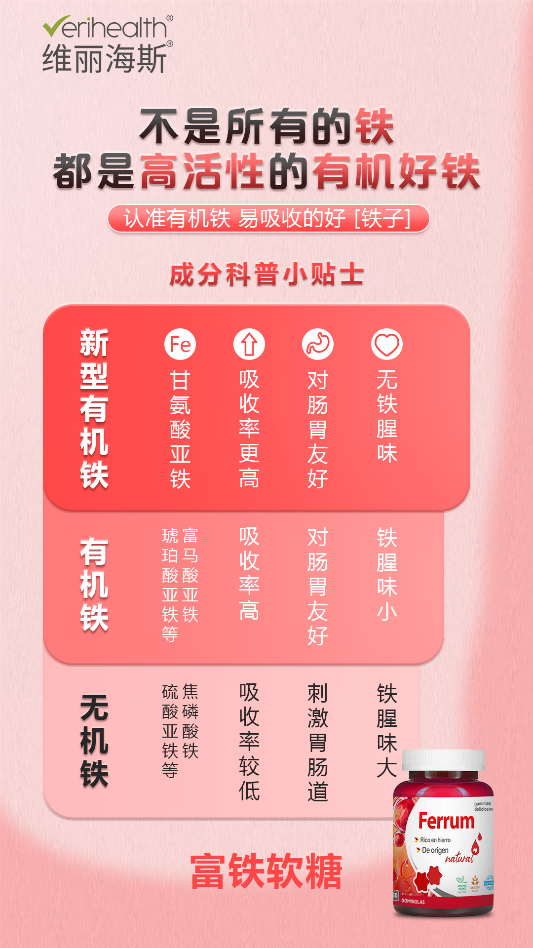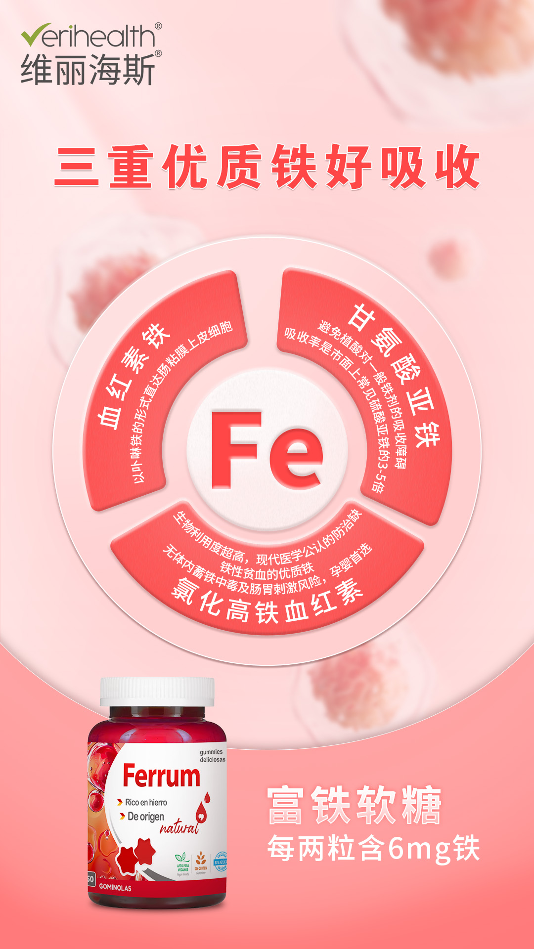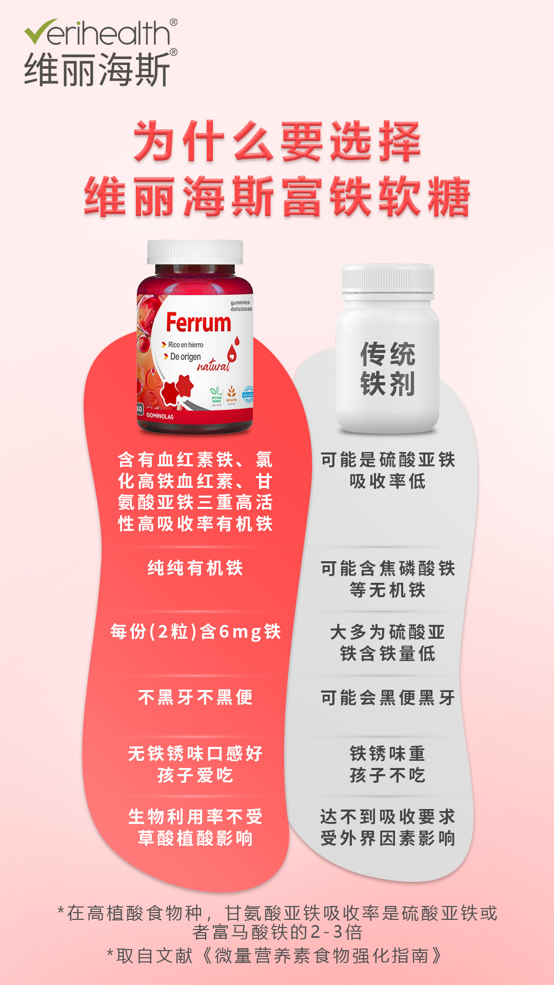 维丽海斯的富铁软糖配方上选择的三种铁剂融合:第三代的甘氨酸亚铁以及第四代血红素铁两种铁剂,以卟啉铁的形式直接补充。沿袭了一如既往的低温脂质体专利技术,一如既往的高吸收率!不受时间、空间、其他食物草酸/植酸的影响。这也就大大减小了限制,不论什么时候忘记补充都可以随时补上,不需要考虑吸收率的问题!口感方面直接打破铁剂型铁锈时代,口感酸甜开胃,吃完一颗还想吃。让孩子毫无抵触的接受新事物,分分钟把营养需求补给空缺填补上。