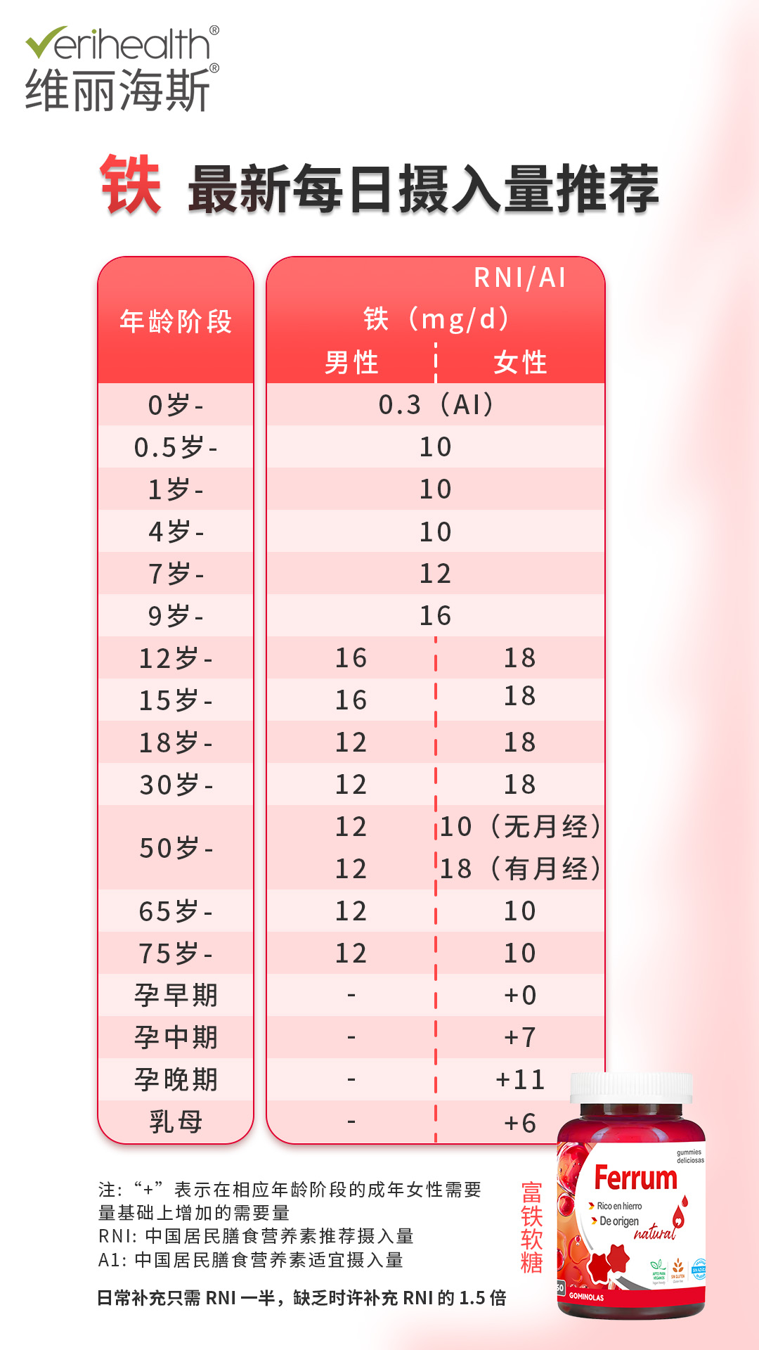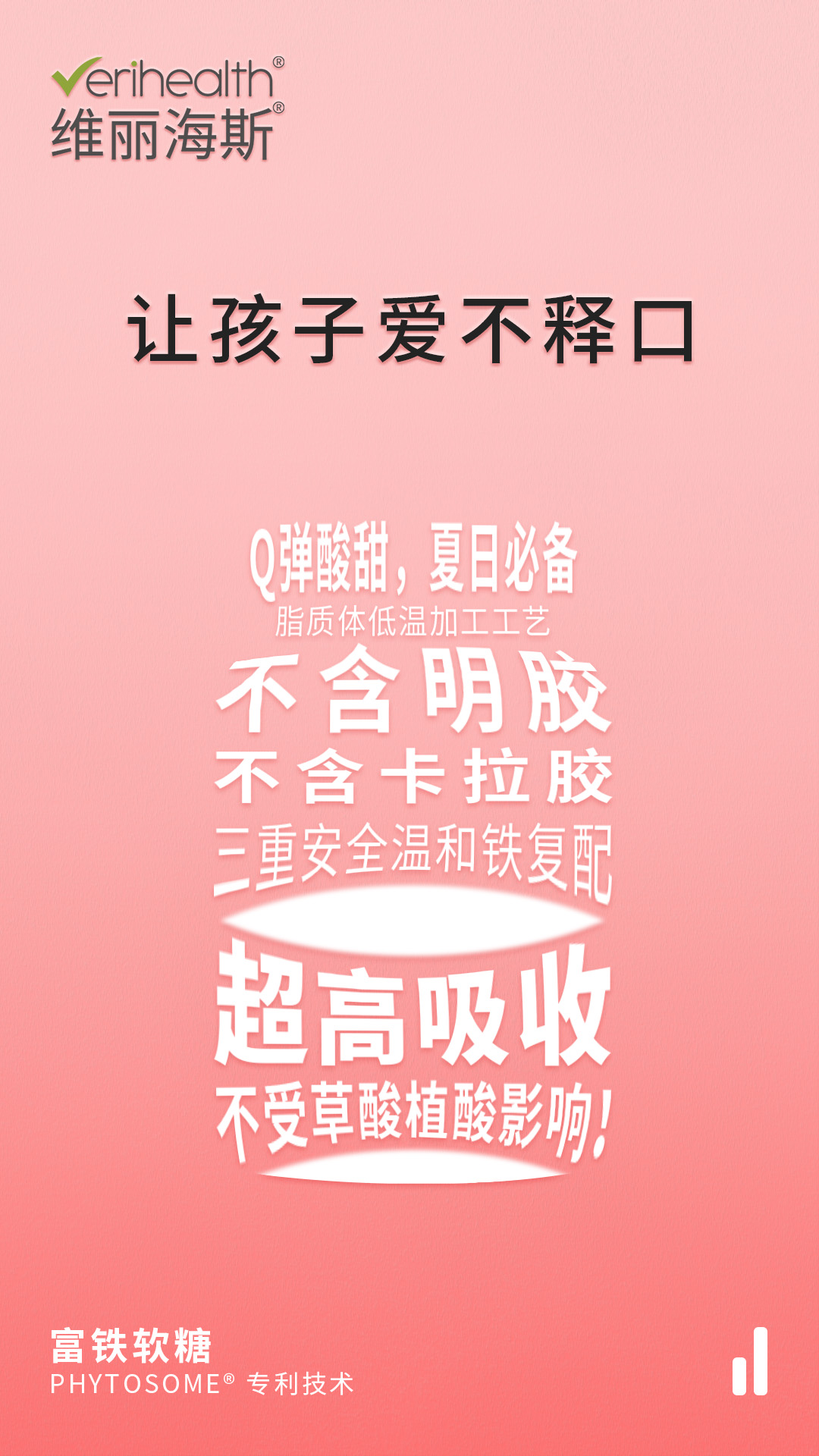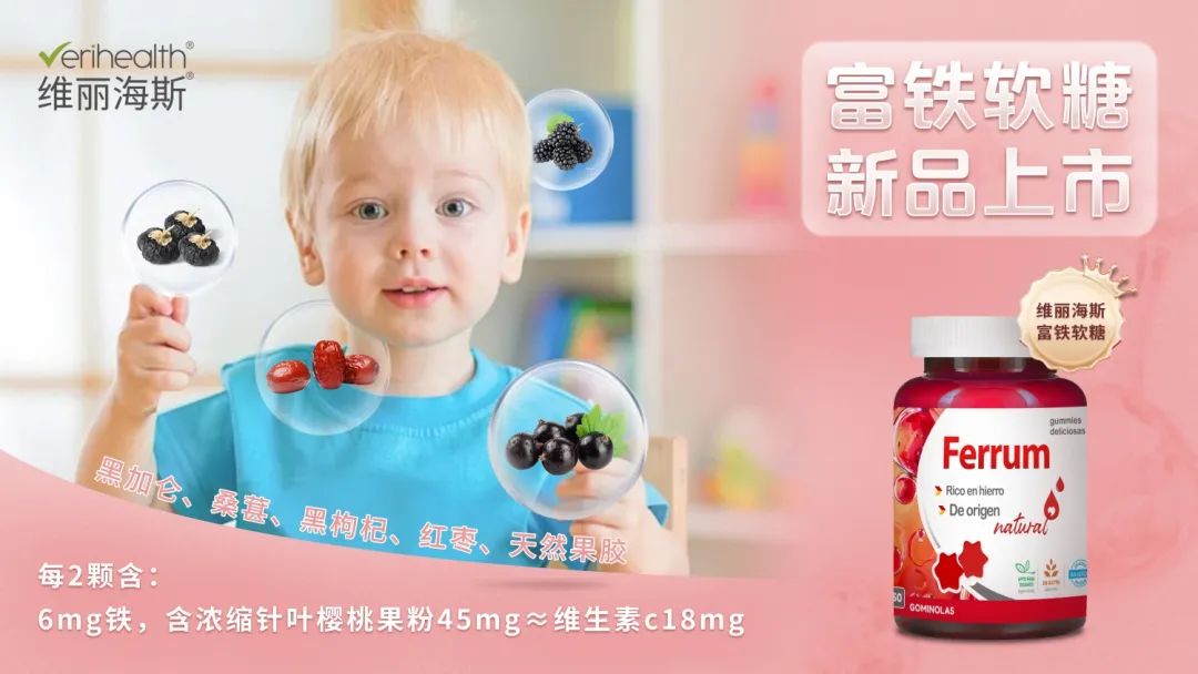 维丽海斯的富铁软糖配方上选择的三种铁剂融合:第三代的甘氨酸亚铁以及第四代血红素铁两种铁剂,以卟啉铁的形式直接补充。沿袭了一如既往的低温脂质体专利技术,一如既往的高吸收率!不受时间、空间、其他食物草酸/植酸的影响。这也就大大减小了限制,不论什么时候忘记补充都可以随时补上,不需要考虑吸收率的问题!口感方面直接打破铁剂型铁锈时代,口感酸甜开胃,吃完一颗还想吃。让孩子毫无抵触的接受新事物,分分钟把营养需求补给空缺填补上。