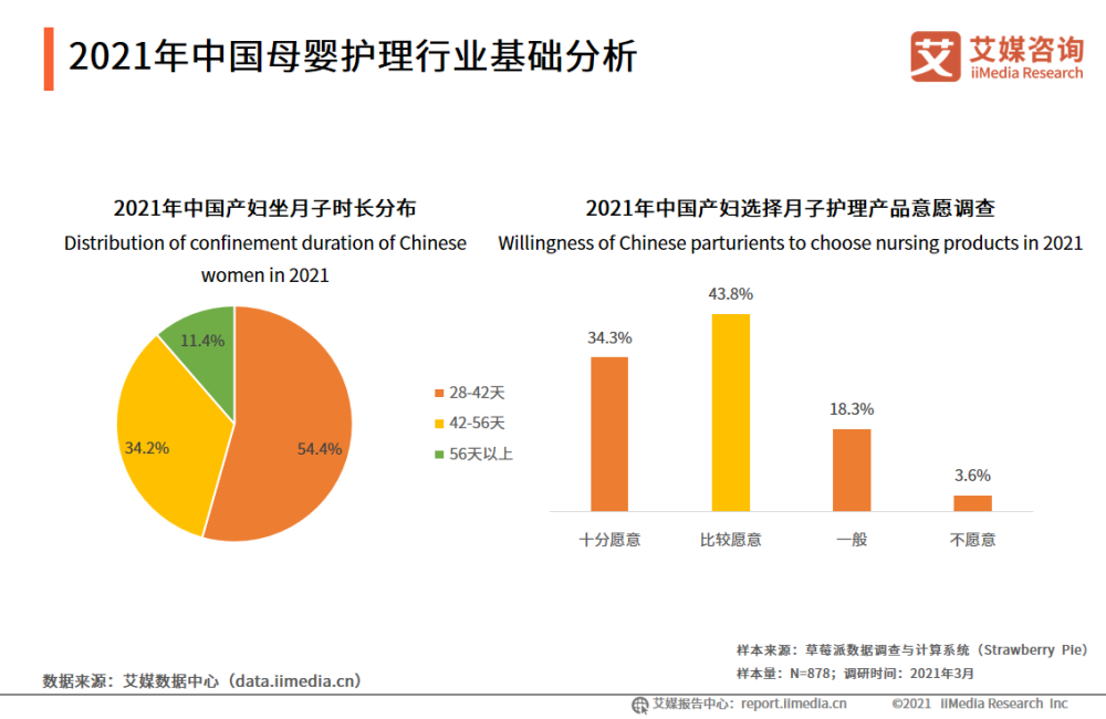 数据显示,中国产妇坐月子的时间集中在28-42天,占比54.4%,此外在56天以上的比重在11.4%,坐月子在一个月左右是主流。女性是职场中的重要力量,但随着职场竞争以及性别歧视等因素存在,女性为了快速回到职场,加上女性收入的提升,对月子产品等可以快速恢复身体的护理产品的消费意愿较高,数据显示,超过78%的产妇愿意选择月子护理产品。