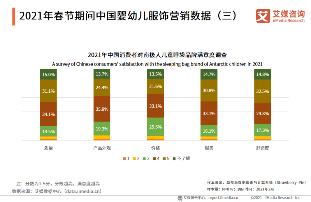 数据显示,消费者对南极人儿童睡袋的质量、产品外观、服务、舒适度和价格等各维度的满意度都比较高,其中舒适度、质量和服务的满意度相对高于产品外观和价格。在价格上,25.5%的用户满意度持中立态度,因而南极人品牌在价格上还有满意度提升的空间。
