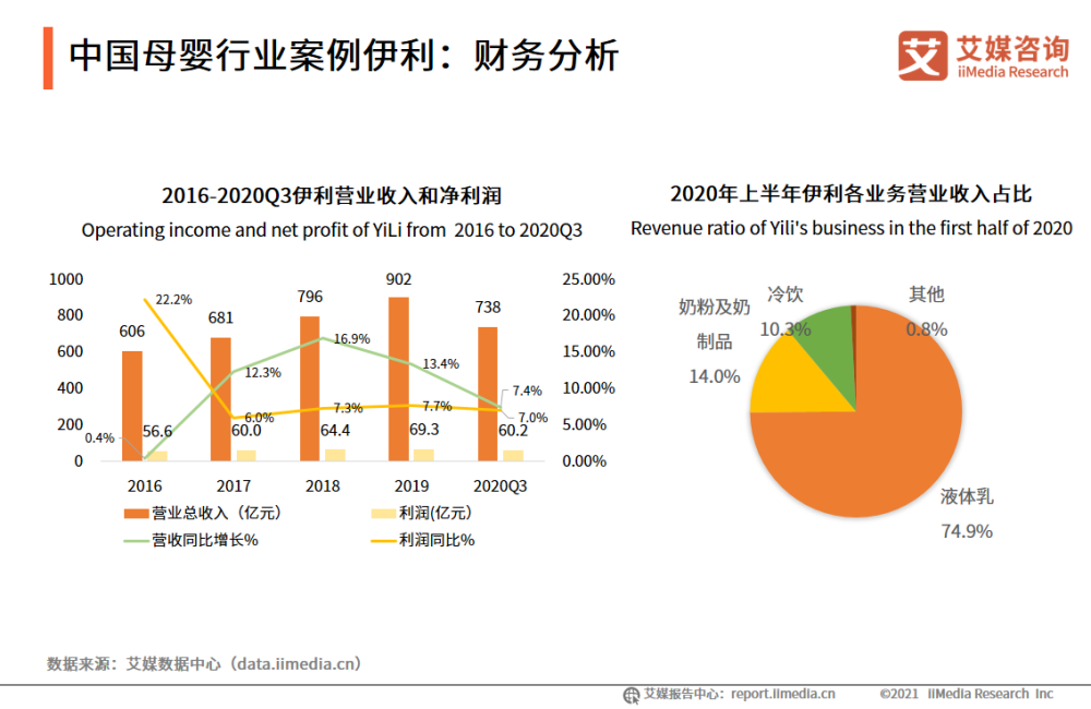 数据显示,2016年以来,伊利营业收入和净利润呈增长态势。2020年前三季度,伊利的营业收入共738亿元,同比分别增长7.42%。其中液体乳产品系列在2020年上半年实现营收354.44亿元,占收入的74.9%,成为收入增长的主要引擎。艾媒咨询分析师认为,伊利紧跟消费趋势,2016年至2019年期间营收及利润稳步增长,液体乳产品超过七成营收额,是伊利未来将要重点发展的产品品类。