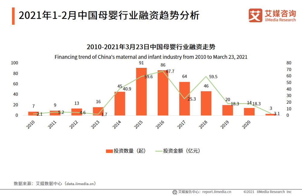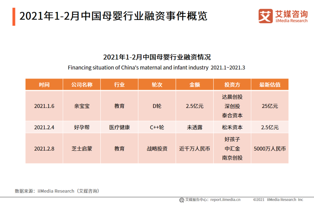 2021年1-2月份,中国母婴行业共发生3起融资事件。芝士启蒙作为在线早教平台,业务遍及16个国家,近日也获近千万元战略融资;好孕帮,一款专业辅助不孕不育、难孕难育人群怀孕的APP,获得松禾资本C++轮投资;亲宝宝,数字时代的育儿品牌,在2021年1月份获2.5亿元投资。