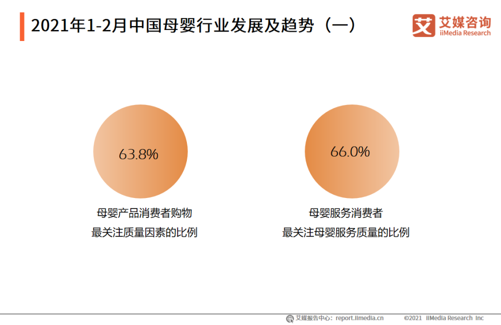 2021年1月,婴儿用抑菌霜造成“大头娃娃”事件刷爆网络,事件背后是网民及家长们对母婴产品质量的担忧。数据显示,消费者在选购母婴产品、选择母婴服务时先考虑的都是品质要素。具体而言,63.8%的消费者购买母婴产品时先考虑产品品质;66.0%的消费者选择母婴服务时,先考虑服务平台阿姨的综合技能等服务质量要素。艾媒咨询分析师认为,随着年轻一代消费观念及消费品质发生了明显变化,以及对产品和服务品质重视,企业在推出母婴产品及相关服务时,需要特别注意及警惕品质问题。