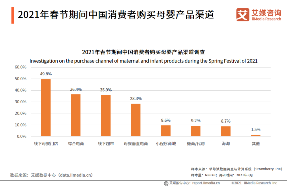 数据显示,接近一半的受访者在2021年春节期间购买母婴产品的渠道是线下母婴门店,其次是综合电商平台和线下超市,占比分别为36.4%、35.9%,可见春节期间母婴产品购买渠道更为集中在线下。艾媒咨询分析师认为,春节期间虽然电商平台商家“不打烊”,但是部门地区快速网点会放假,因而线下成为母婴消费者的备选方案。