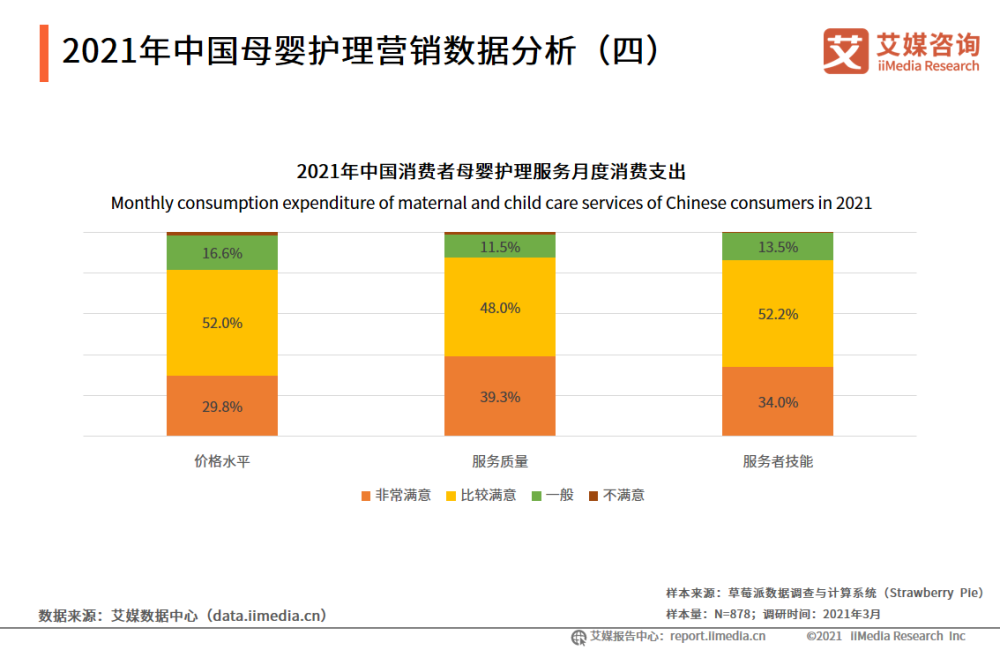 数据显示,中国消费者对母婴护理服务的整体满意度相对较高,具体来看,在表示“非常满意”的维度中,母婴服务质量占比高,接近4成,其次是服务者的技能,接着是服务价格。艾媒咨询分析师认为,在母婴护理行业,初是通过雇佣保姆的形式照顾产妇和婴儿,产品的标准化程度不高,但随着月子中心、月嫂等专业护理服务的出现,护理护理在专业分工、垂直领域上更加专业和标准化,因而满意度较高。