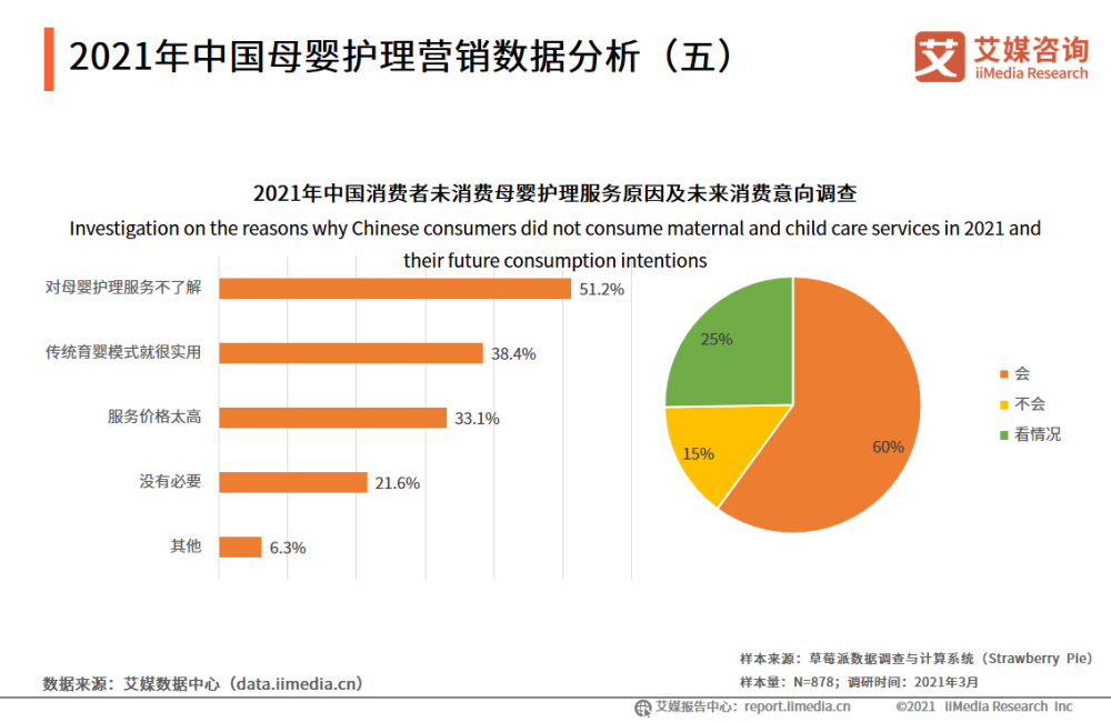 数据显示,在没有消费母婴护理服务的原因中,超过5成是对母婴护理服务不了解,38.4%认为传统育婴模式就很实用,此外还有三成认为当前母婴护理服务价格过高。尽管如此,其中有6成的用户表示未来会使用母婴护理消费。艾媒咨询分析师认为,母婴护理服务需求潜力较大,因而商家可以通过全渠道营销提高产品的社会认知度,同时加快护理服务标准化建设,推出价格更加亲民的护理服务产品。
