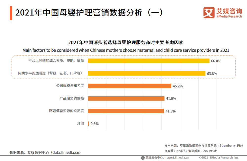 调研数据显示,近6成(59.8%)受访消费者使用过母婴护理服务。在消费者选择母婴护理服务商时,重点考虑服务者的综合素质及其透明度,其次才是公司的规模与知名度、产品价格。艾媒咨询分析师认为,母婴护理帮助孕产妇解放体力劳动,是一种重视体验的服务,因而对服务者的综合素质要求较高。而且一般使用母婴护理的消费者收入也比较高,对服务的价格关注度会下降。