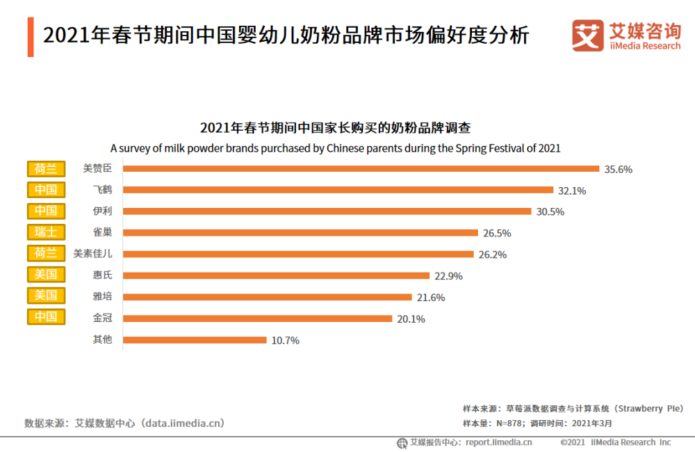 2021年春节期间中国幼儿奶粉品牌市场偏好度分析
